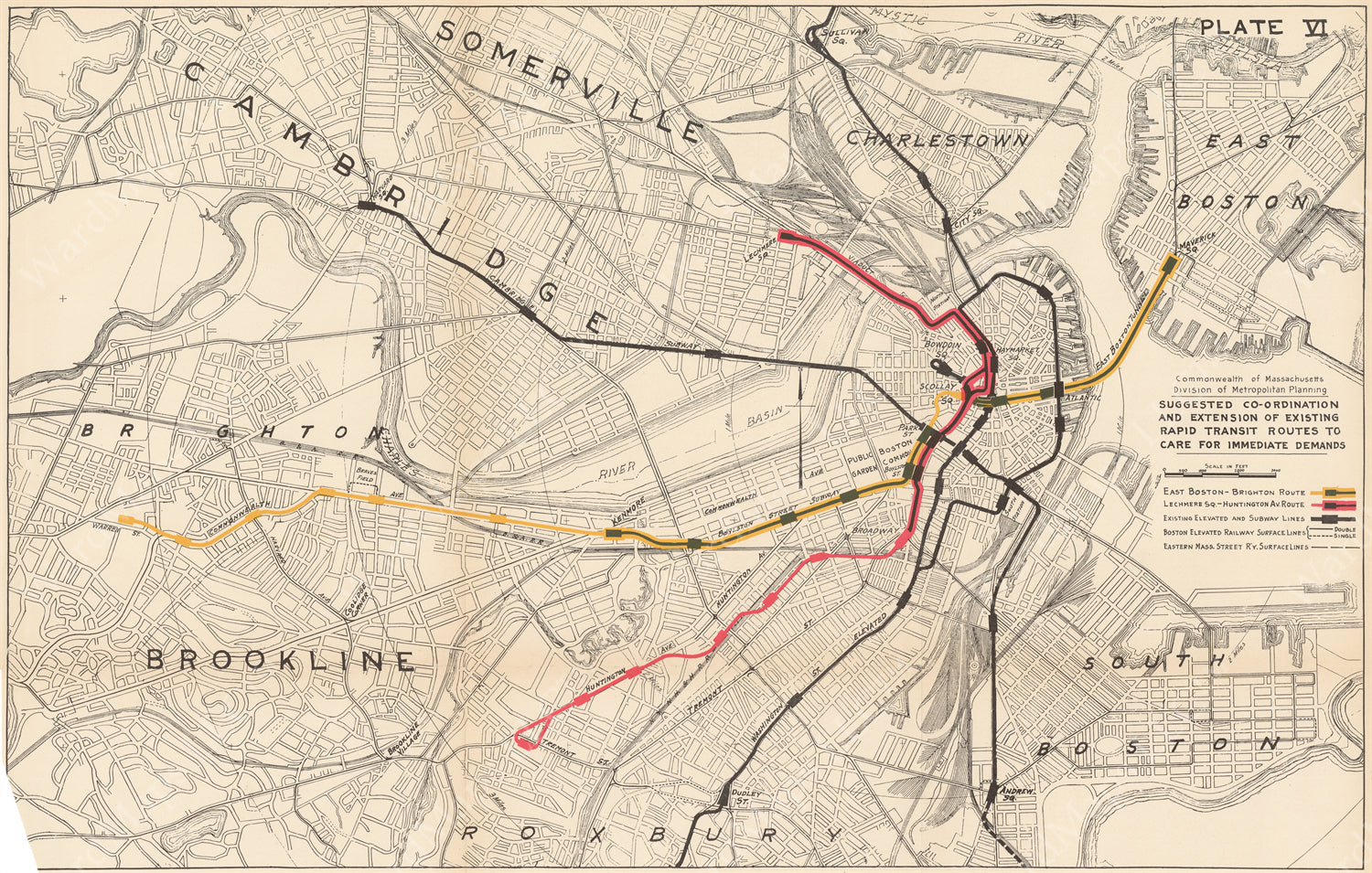 Issued by the Commonwealth’s Division of Metropolitan Planning in their Report on Improved Transportation Facilities in the Metropolitan District, a map shows existing subway, tunnel, and elevated railway lines as dark lines. Stations are dark boxes along each. Highlighted in yellow, is a proposed conversion and extension of the East Boston Tunnel and Boylston Street Subway into a single rapid transit line connecting Maverick Square in East Boston (right) with Warren Street in Brighton (left). Highlighted in pink, is a proposed extension of the Tremont Street Subway and East Cambridge Extension from Lechmere Terminal to Brigham Circle (bottom).